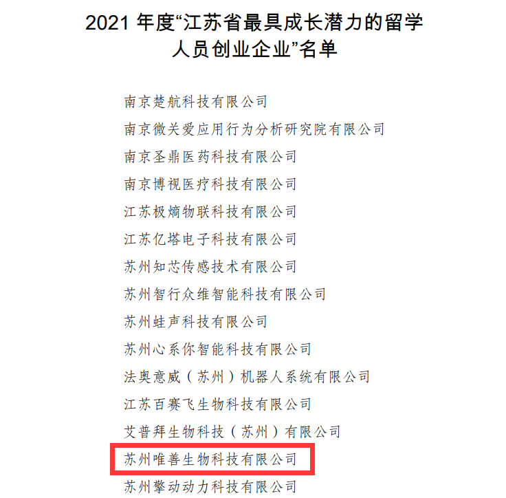 唯善生物上榜2021年度“江蘇省最具成長潛力的留學人員創(chuàng)業(yè)企業(yè)”